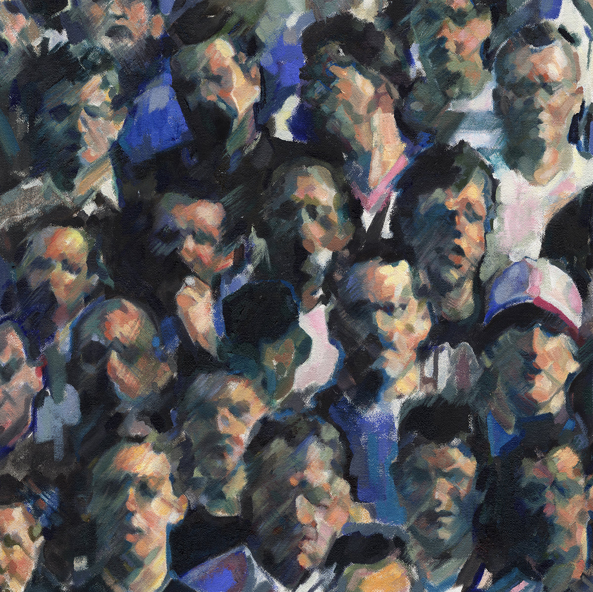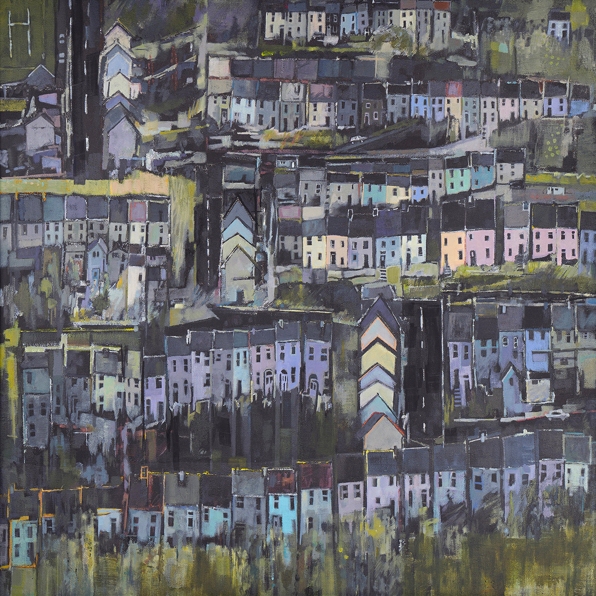 Instead of a traditional landscape painting of a village, this painting is more a group portrait where the houses stand for people. Every house has its own personality and they huddle together on the steep sides of the South Wales Valley. Mixed media on canvas.